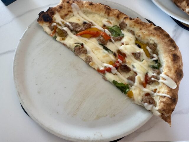 Il menù si apre con la classica friggitoria e prosegue con la tradizione: Margherita a 6 €, a testimonianza di una proposta molto accessibile. Seguono pizze con gusti più creativi e personali. Tra quelle che colpiscono c’è la Provola e Pepe – fuori menu, ma assolutamente da chiedere – con la giusta dose di pomodoro e pepe, un’affumicatura marcata della provola come nota inconfondibile, e, a completare, un generoso giro d’olio extravergine d’oliva (7 €).