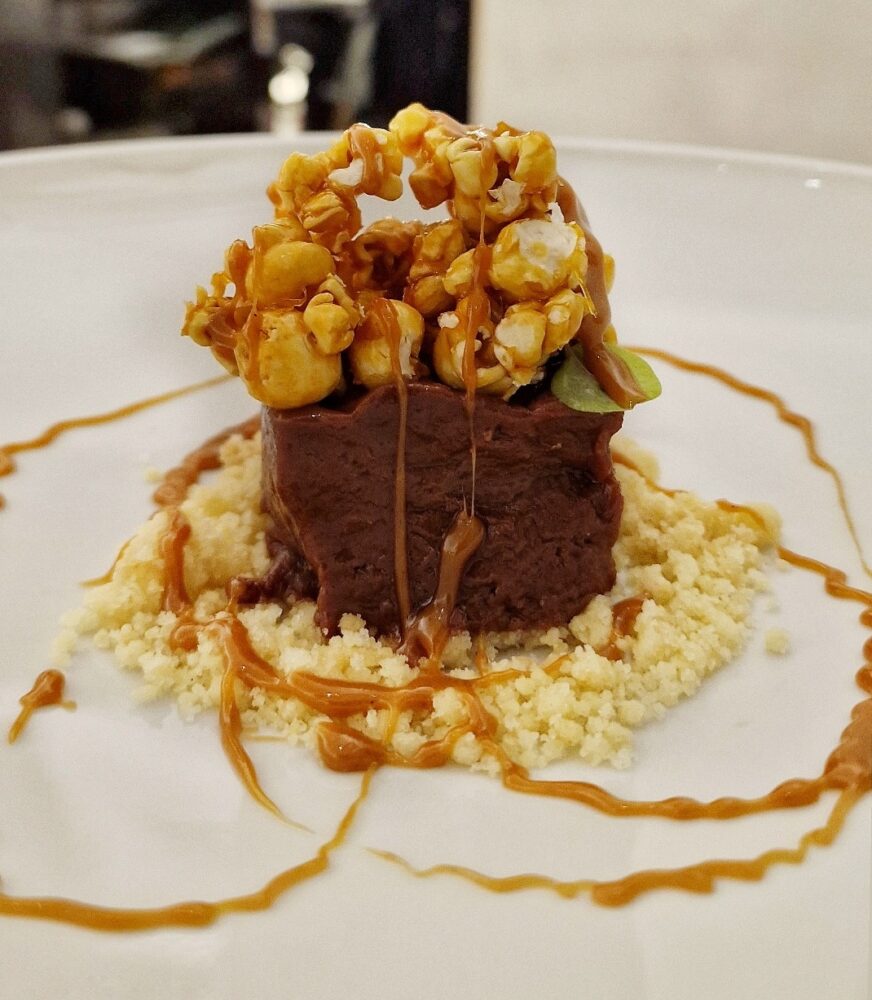 Colpisce “Ritorno Bambino”, il dolce cremoso di cioccolato al latte, crumble all’olio di oliva, pop corn caramellati e salsa al caramello versata al tavolo.