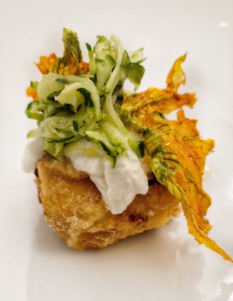 Il secondo prevede invece, bucatini con vellutata di zucca e pecorino fritti in tempura, zucchine alla julienne e fiori di zucca disidratati.