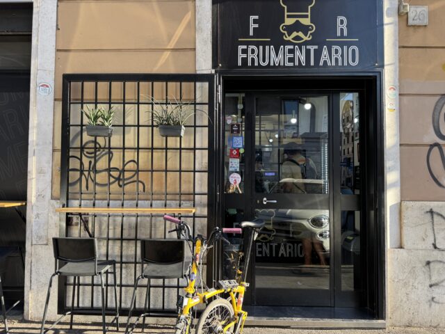 Frumentario è il laboratorio di pizza in teglia di Alessandro Santilli, chef lievitista che ha portato l’alta cucina sul trancio. Siamo a Roma, in via Tuscolana, all’angolo con piazza Re di Roma, e questo piccolo locale di quartiere in meno di due anni è arrivato al vertice della classifica 50 Top Pizza categoria “Pizza in Viaggio in Italia 2025”. Il nome Frumentario richiama le antiche leggi frumentarie dell’epoca romana, che regolavano la distribuzione del grano alla plebe. Un riferimento che oggi si carica di un significato contemporaneo: una pizza per tutti, popolare, ma con l’ambizione di offrire un’esperienza da fine dining, accessibile e quotidiana.