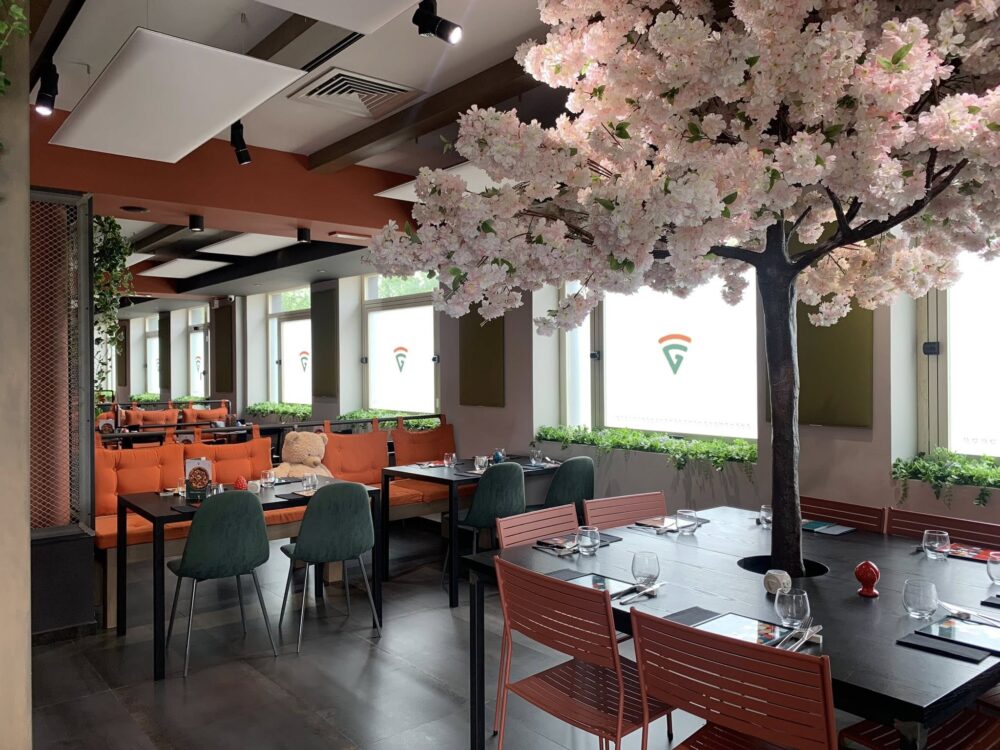Un luogo della gioia, con tante sedie colorate e comode panche dove trovano posto qua e là dei giganteschi orsacchiotti di peluche.