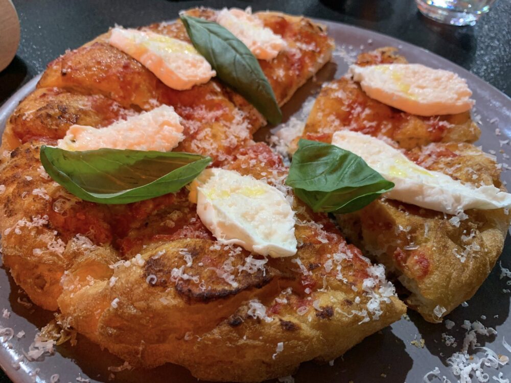Ben fatta la pizza Finta Bruschetta, a tre cotture ( vapore, fritta e al forno), condita con la stracciata di mozzarella, un mix di pomodori marinati e un inaspettato touch delicato di crema all’aglio.