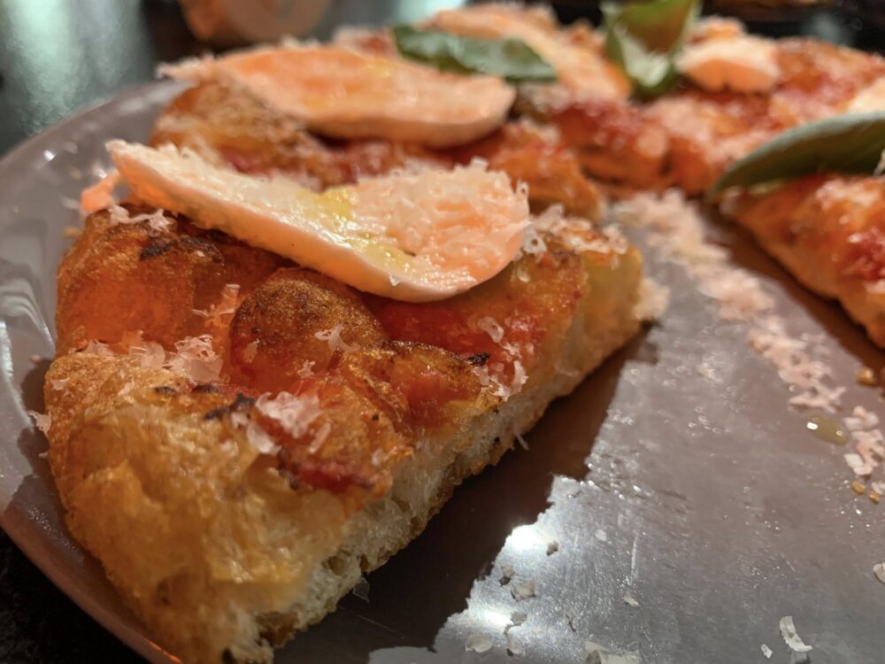 Studio e volontà di crescere hanno determinato un risultato che è un trampolino di lancio per qualcosa in più, visto che ha tutte le carte in regola per poterlo fare. Il menù dell’Estate 2023 è variegato e permette di assaggiare gli impasti ben fatti di Gianpà, con versioni delle pizze che dalla tradizione virano alla creatività forte (fin troppo, a mio modesto parere, dove in qualche caso si perde l’equilibrio e si gioca di sola morbidezza e dolcezza). Da sottolineare l’ottima materia prima dei topping, la scioglievolezza e la leggerezza dell’impasto, nonché la cottura perfetta della pizza dallo stile contemporaneo. Gian Paolo è un vulcano di idee e ama appunto sperimentare, mettersi alla prova, nonostante la timidezza e la riservatezza del carattere.