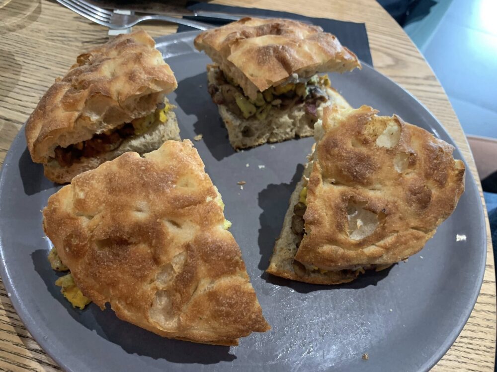 Il menu delle pizze è vario. Oltre ad una scelta di sfizi iniziali, ci sono le pizze classiche (molto ben eseguita la margherita), quelle farcite al padellino, e la specialità della pizza in tre cotture: abbiamo provato la ‘DOC’ con pomodoro, basilico e bufala in uscita. Il risultato è di una golosità assoluta, croccante, profumata, buonissima.