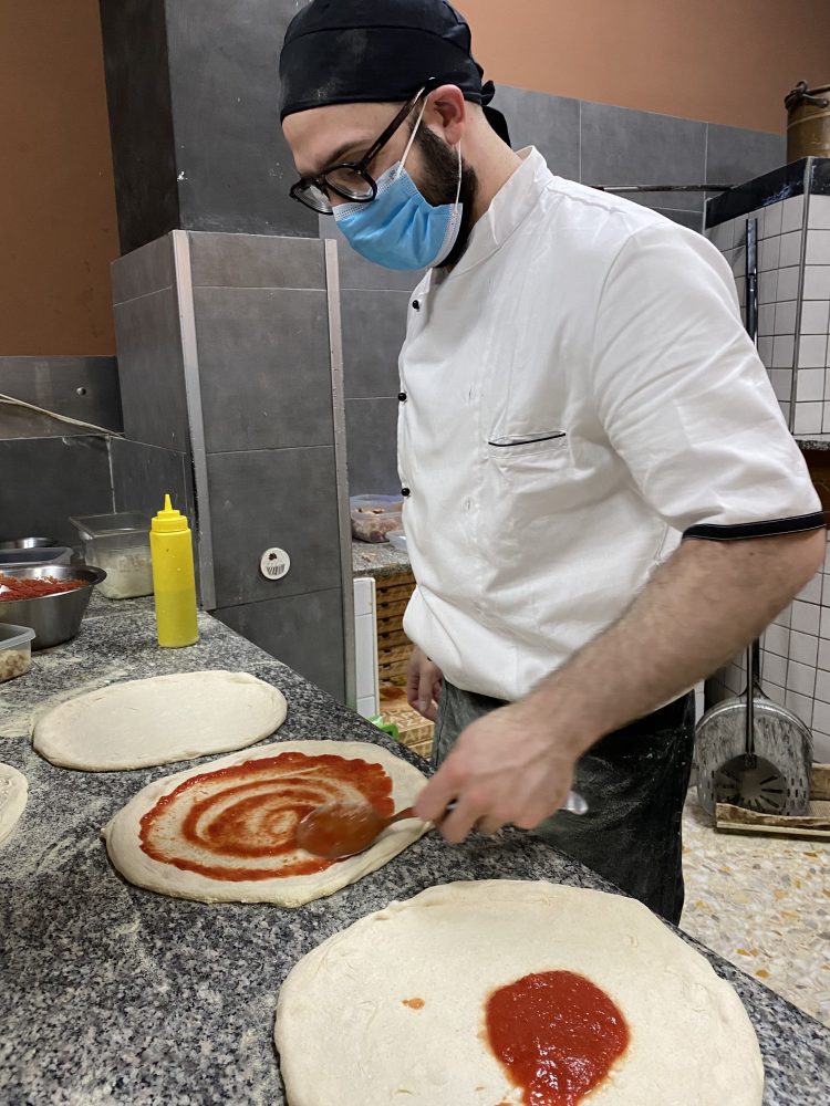Giovanni, figlio di pizzaiolo e nipote di fornaio, nella piccola pizzeria che attualmente conta solo 20 posti (contro i 40 di capienza pre-covid) fa anche molto, moltissimo, asporto.