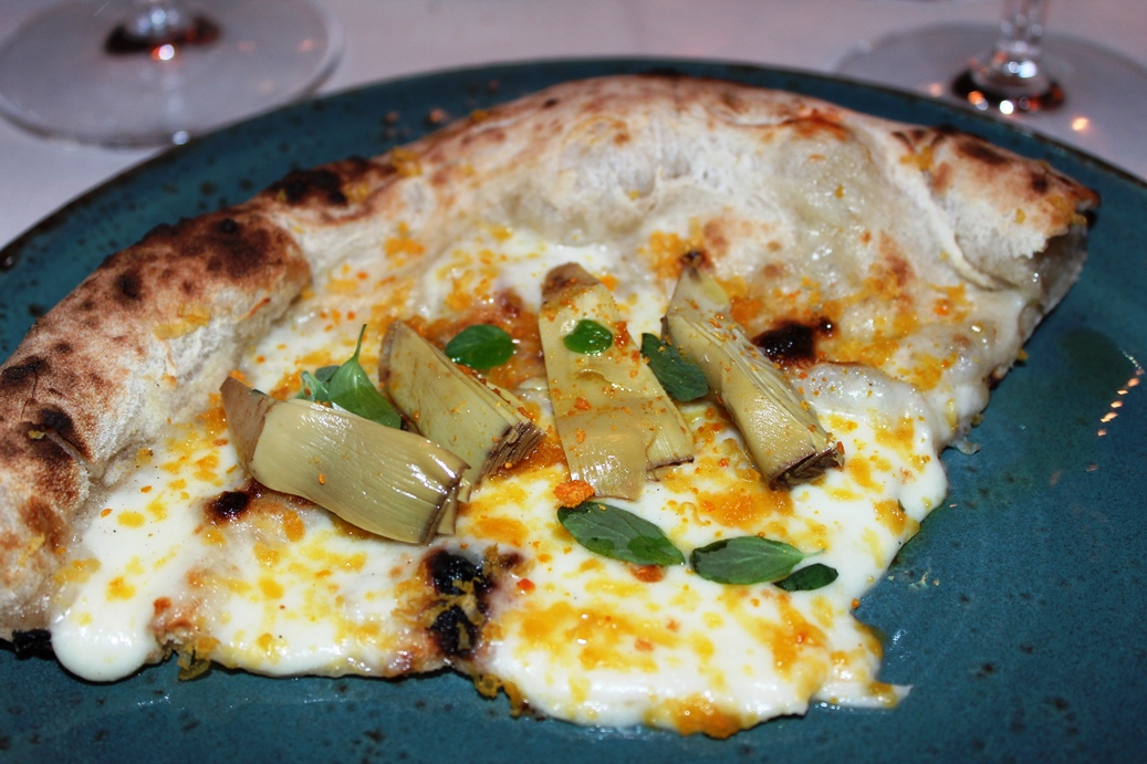 Pizze che prevedono l’utilizzo di farina di tipo uno ci restituisco un gusto rustico e aromatico, tutti gli abbinamenti sono pensati per essere piacevolmente eleganti e lunghi. Ingredienti ottimi, il meglio su e giù per la penisola con la Campania che ha un ruolo importante, partendo dall’ottima mozzarella di bufala del caseificio MAIL . Scopro una bottarga sensazionale, iodica e non sapida, quella prodotta da Pino Spanu a cui è dedicata la pizza che più mi ha colpito e che prevede, oltre alla mozzarella, l’aggiunta di carciofi e polvere di arancia .