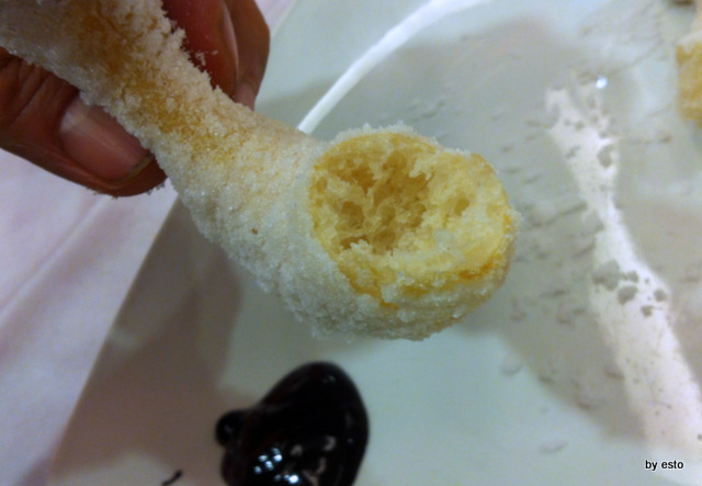Dorate, rivestite di zucchero, soffici da intingere se si vuole con la crema di cioccolata fondente o quella di pistacchio. Il vero pistacchio, lo si vede dal colore. Deliziose.