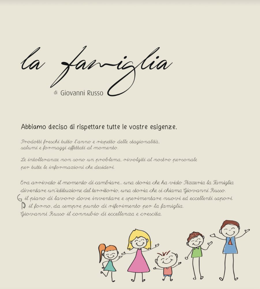 La qualità degli ingredienti accompagna la continuità del successo della pizzeria La Famiglia, dove Giovanni Russo – a soli 29 anni – riesce sempre a conquistare gli irriducibili affezionati che affollano la sua sala. E’ premiato dal pubblico per l’impegno, e anche per la sua crescita che in questi anni non si è mai fermata.