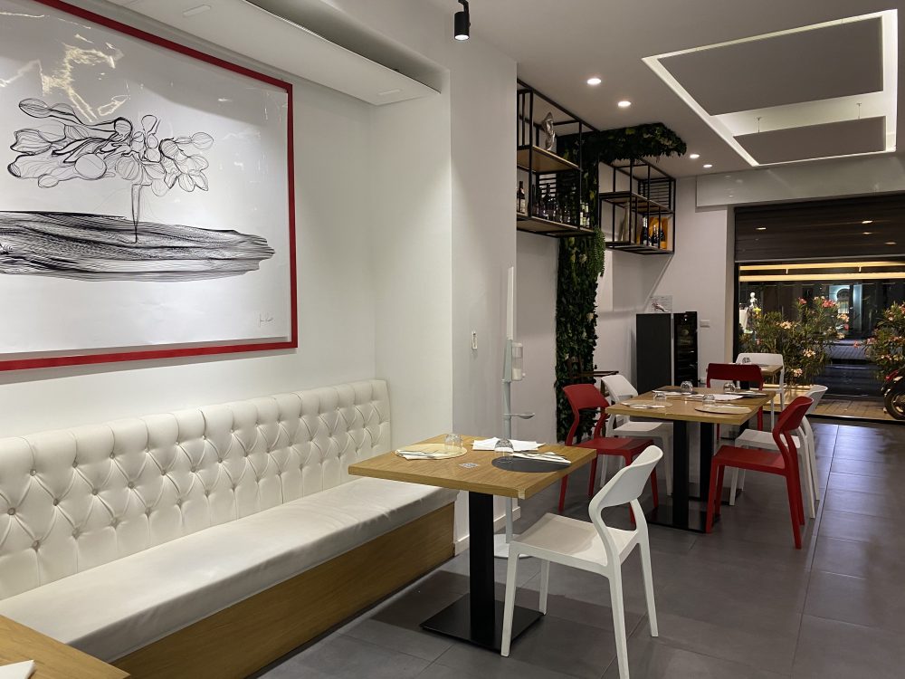 L’arredo è moderno, l’ambiente informale e luminoso, con due forni a vista all’ingresso, due le sale e, al centro di quella più grande, troviamo un albero di ulivo che sta a simboleggiare la vita, le pareti sono colorate, i tavoli e le sedie di designer, la mise en place minimal, in linea con le pizzerie contemporanee.