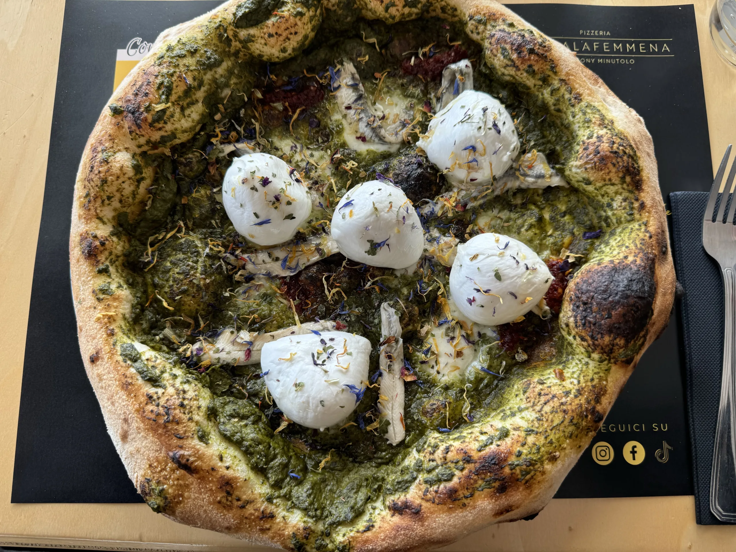 Alice in broccolo: Vellutata di broccoli locali, ciuffi di nduja di Spilinga, alici di Ponza marinate in sale e zucchero, ciliegine di bufala ed olio al limone Oro di Caiazzo