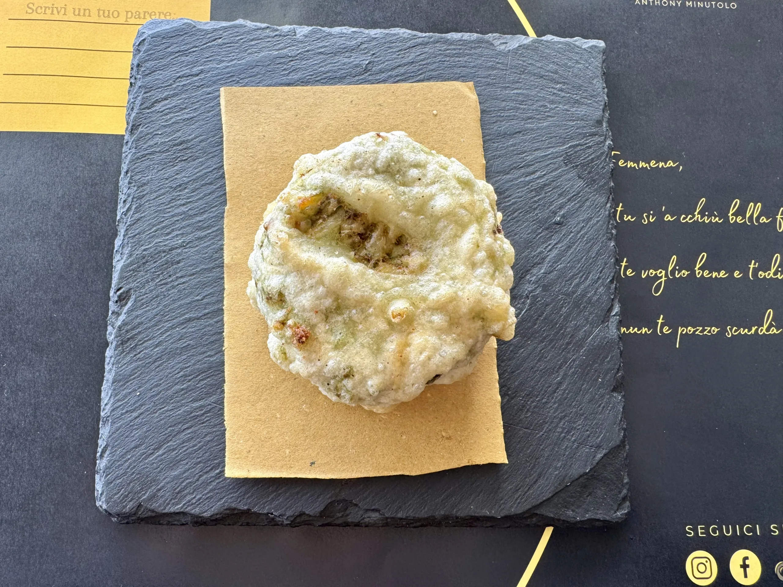 Frittatina – Pizzeria La Malafemmina 27/1/2024 Torna a: Pizzeria La Malafemmina di Anthony Minutolo a Formia: la pizza contemporanea che unisce tradizione e creatività Frittatina – Pizzeria La Malafemmina← PrecedenteSuccessiva →