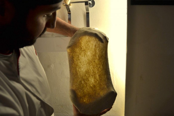Nel tempo, questo suo personale approccio al lavoro, lo ha spinto lontano dai cliché e dai luoghi comuni, una condizione questa, che lo ha obbligato a mettere a punto un suo personalissimo tipo d’impasto. Il risultato è un ibrido, un impasto a metà strada tra la pizza napoletana e quella romana, dentro il quale sono concentrate le migliori caratteristiche delle due strutture. La pasta, preparata con farine macinate a pietra e lievito madre, viene lasciata maturare per almeno 72 ore prima di essere utilizzata, tutto ciò per ottenere una pizza incredibilmente leggera ed altamente digeribile. E lo è davvero.