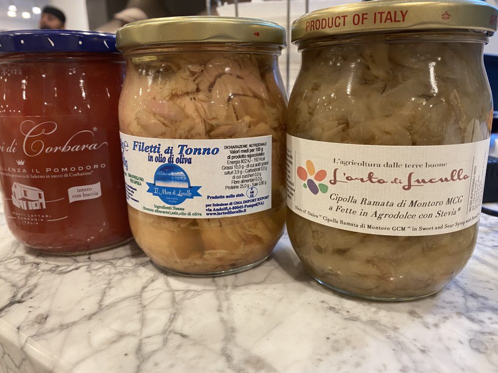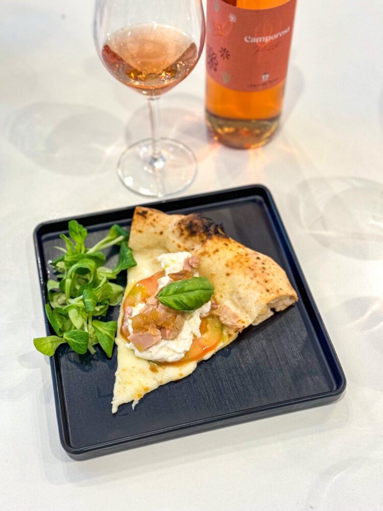La pizza Il Cavaliere – una focaccia lardiata – è con il conciato romano Le Campestre, il miele di Bucciano e la mela verde, mentre La Gustosa vede l’impiego di un ottimo tonno di Cetara, del fior di latte di Agerola, pomodorini gialli e olive caiazzane.