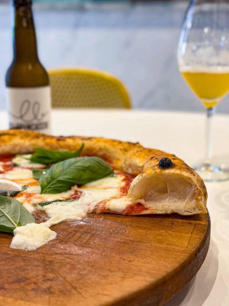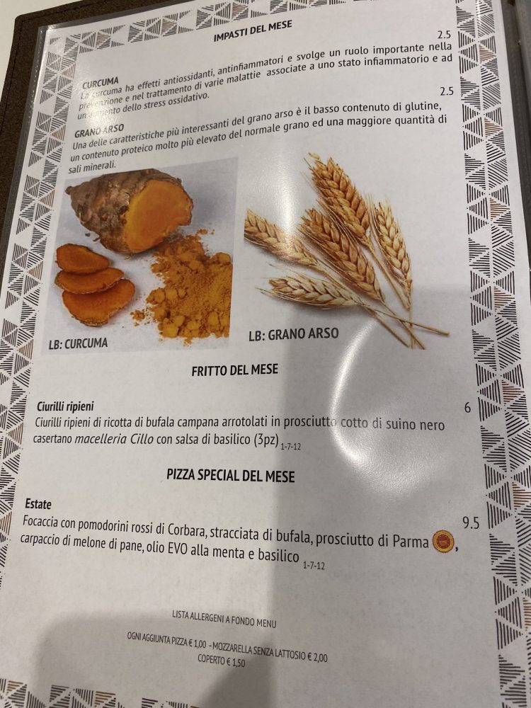 A proposito di impasti: dal 1991 Luca prepara quello con grano arso, e/o con la curcuma, che ha opportunamente inserito anche nella carta del nuovo locale. I prodotti per il topping sono di qualità. La pizza Scarpariello per esempio è condita con i pomodorini di collina Quisisana di Marianna D’Auria, aglio di Nubia, crosta di pecorino romano riserva 20 mesi e olio extravergine Principe Pignatelli.