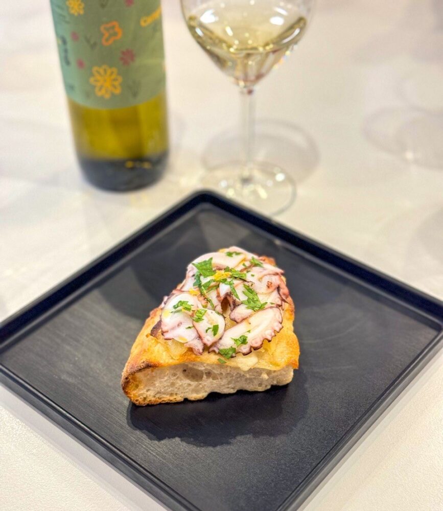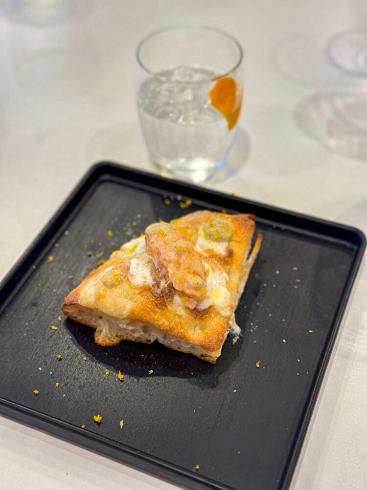 Genovese di mare pizza in 3 cotture (fritta 180° – forno a legna 380° – forno elettrico 300°) con ragù di cipolla cotta a bassa temperatura, tarallo di Leopoldo e tonno rosso del Mediterraneo, abbinata al prosecco doc Treviso extra dry, Silky.