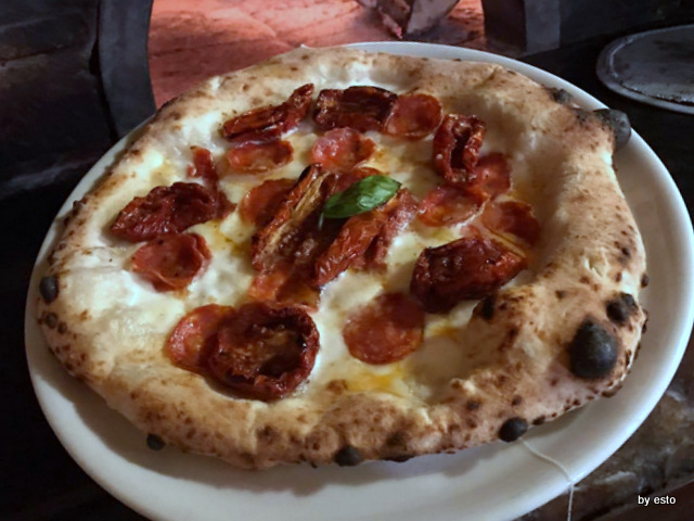 La Diavola del Cilento con fiordilatte, salsiccia piccante e pomodori secchi cilentani.