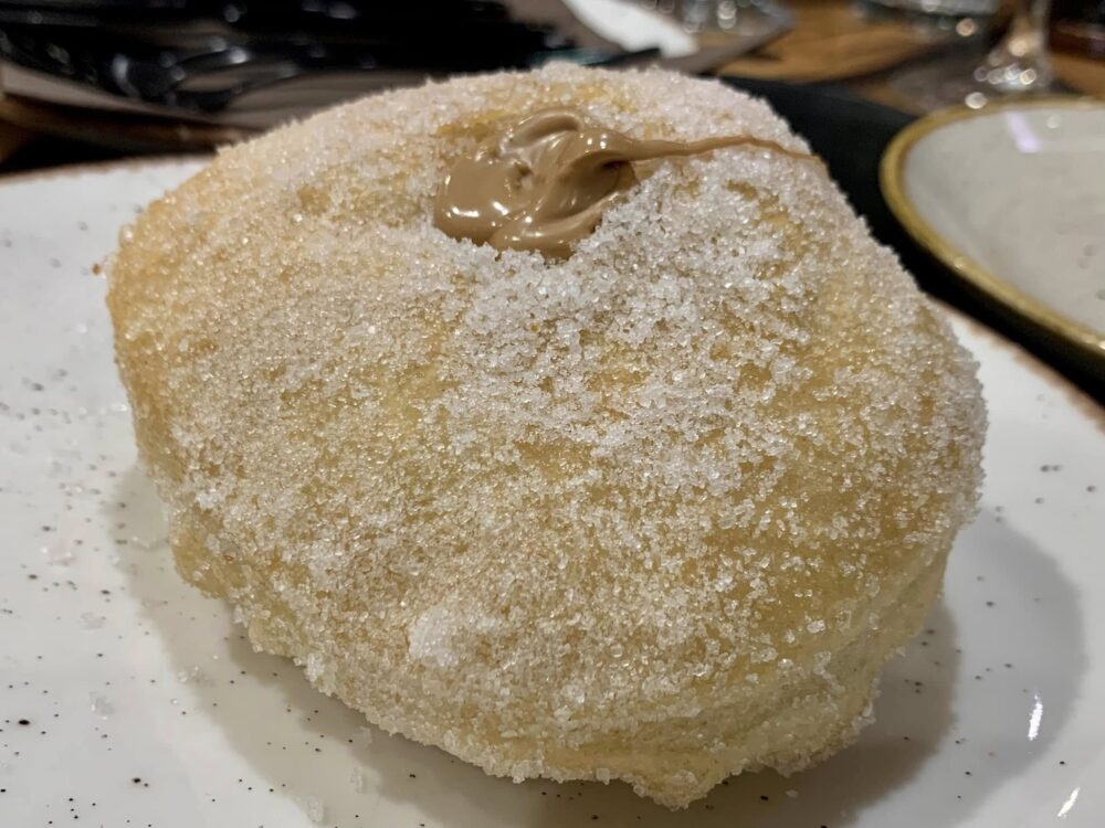 Si parte proprio con Domenico Vicinanza che dà il benvenuto agli ospiti in sala con una rivisitazione salata della classica zeppola di San Giuseppe ripiena di burrata, gamberi crudi, fichi e finocchietto servita con un calice di Asprinio d’Aversa Martinotti Brut Trentapioli 2016 di Salvatore Martusciello.