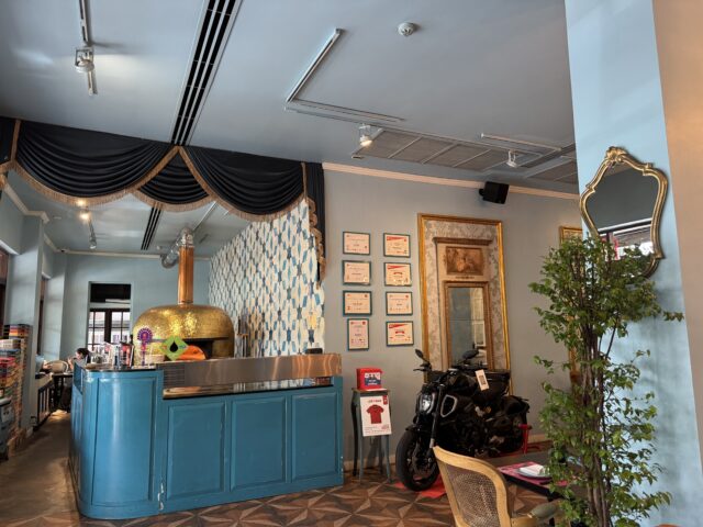 Aperta dal pranzo con orario continuato fino a sera, il menù propone una selezione centrata sulla pizza, ma arricchita da specialità della cucina tradizionale italiana: polpette al ragù, parmigiana, supplì, taglieri di salumi e formaggi DOP, primi piatti iconici del Bel Paese e dolci come tiramisù e pastiera napoletana, quest’ultima eseguita con grande precisione, con la caratteristica umidità ben calibrata e servita con gelato alla vaniglia home made. Materie prime italiane, ad esempio la finocchiona, il provolone del Monaco, la ‘nduja, l’olio extravergine d’oliva, la mozzarella, la burrata, il pomodoro, l’origano di montagna, sono protagoniste dei piatti e vengono abbinate a ingredienti thailandesi, come le verdure, la frutta e le spezie.