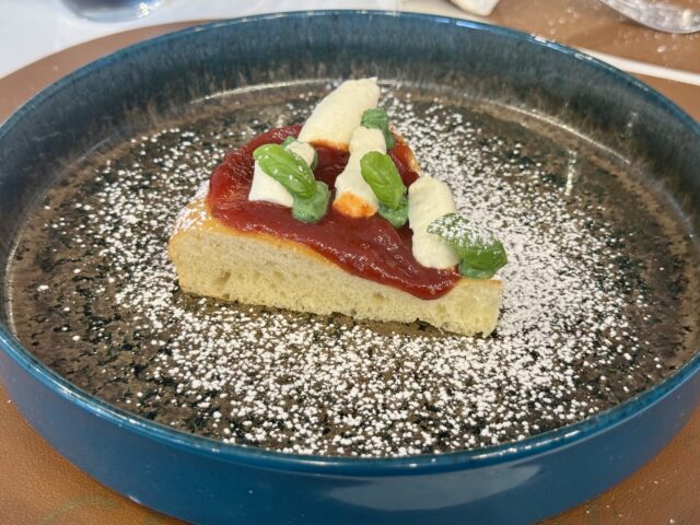 Continuiamo poi con due pizze in padellino, una con impasto alla polvere di pomodoro con provola affumicata e pepe e una con grano arso e noci con pancetta steccata selezione Aiello. Interessante l’idea di realizzare un impasto con la polvere ottenuta con il recupero delle “pellecchielle” del pomodoro una cui maggiore intensità la renderebbe persino più golosa.