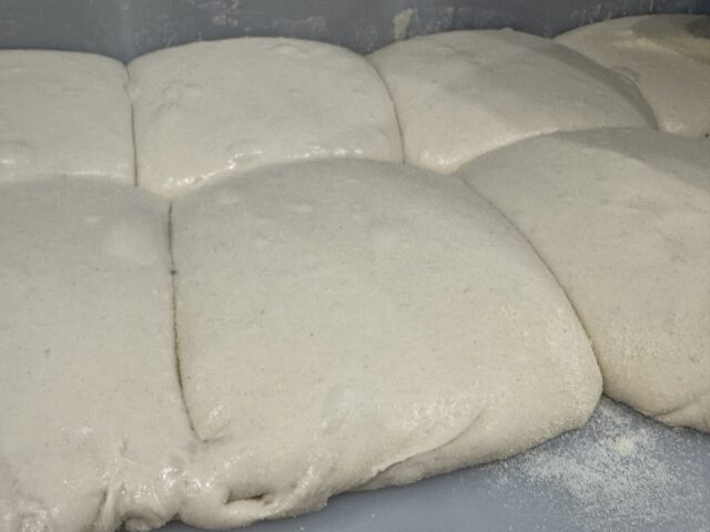 La pizza di Raffale parte dall’impasto realizzato con lievito madre e licoli, che include una fase di prefermento e una lievitazione di circa 48 ore.