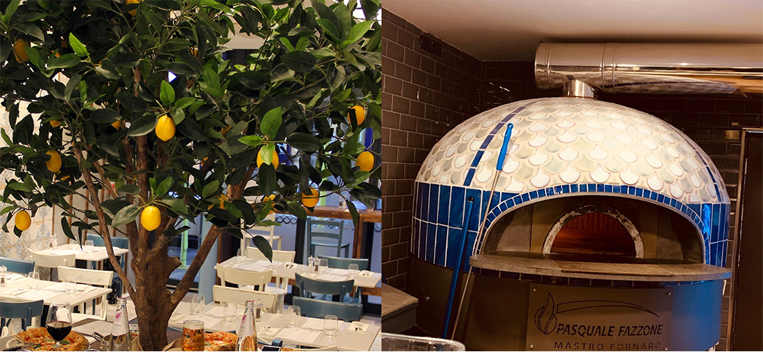 The entrance is welcoming, well-kept, with a few tables outside and a large window with a counter. Inside, the blue hues of the majolica tiles and the large lemon tree immediately catch the eye, while the oven is visible as well as the bar, allowing customers to observe the various preparations.