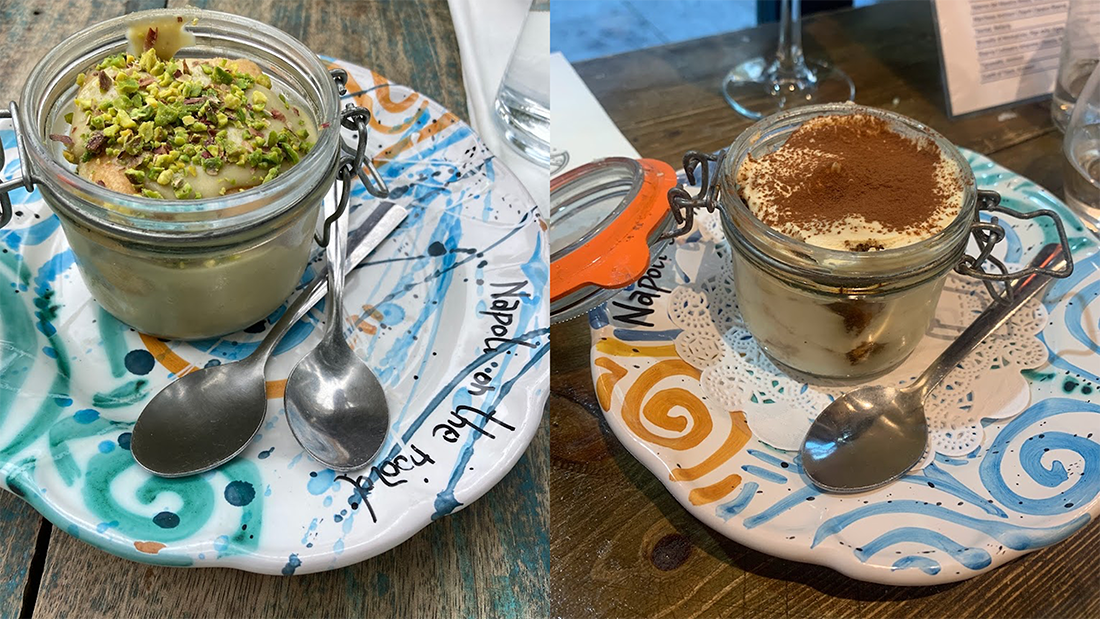 Squisiti anche i dolci con una menzione particolare al tiramisù presente in due versioni, classico e al pistacchio. Crema equilibrata, non troppo dolce, perfettamente bilanciata con il sapore del cacao amaro nel primo e del pistacchio nel secondo.