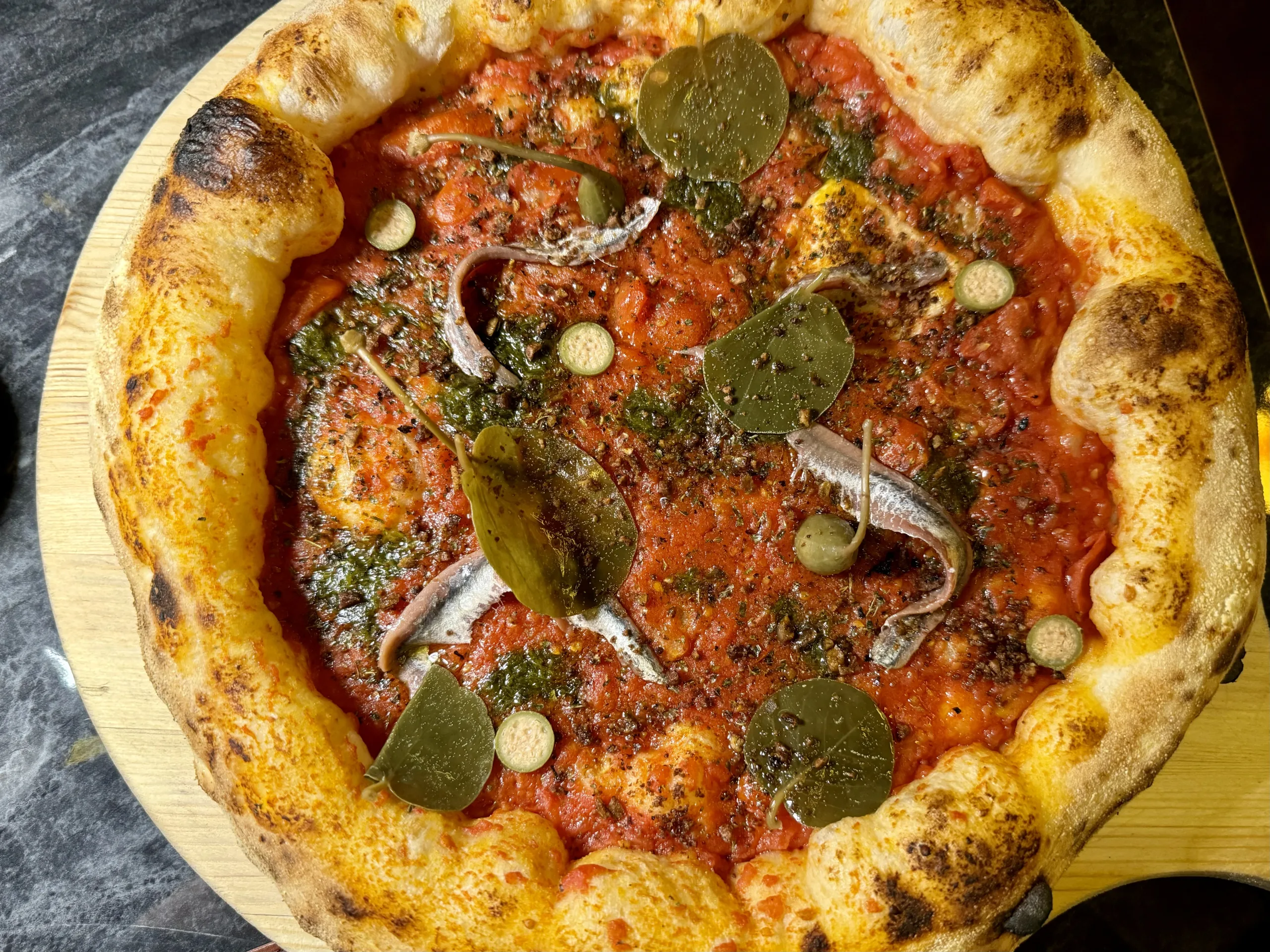 Dalla lista Pizza Experience: Crazy Love – pomodoro pelato al forno, foglia di cappero, polvere di olive caiazzane, alici di Cetara, origano del Monte Saro, aglio orsino – Pasida