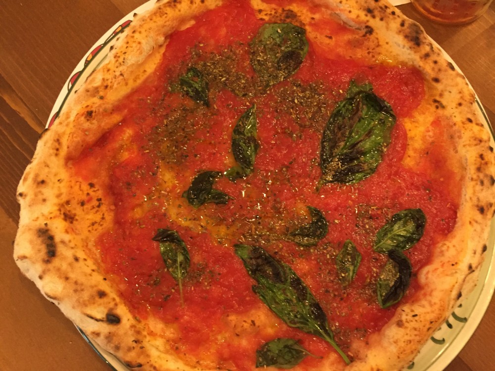 La pizza non è esagerata, non è a rota e’carrett, non ha un cornicione pronunciato, è normale, è semplice, è la pizza napoletana per eccellenza. La mia marinara è profumatissima, origano e basilico a profusione, assente l’aglio…come? Eppure lo percepisco…mi spiegano che il frantoio pugliese da cui si riforniscono produce un olio con le infiorescenza dell’aglio… meraviglioso!