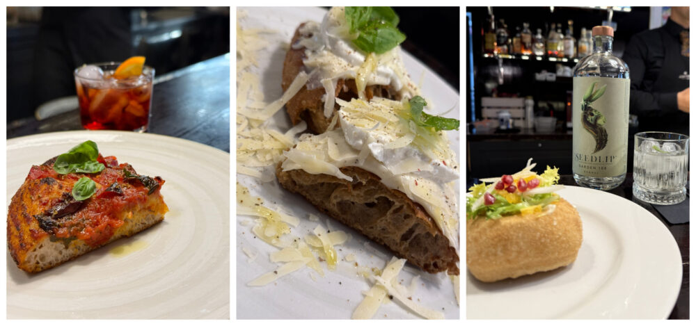 La bellissima Giusy Prisco, sorella di Jack, con la sua naturale riservatezza, riesce a dolcemente a sorprendermi, con un sorriso timido ma deciso, guida la serata con l’uscita delle pizze, nonostante la sua inclinazione a stare dietro le quinte è lei a dare il ritmo alla serata, la sua presenza, silenziosa ma sicura, diventa il filo invisibile che tiene tutto insieme, mostrando, senza farlo notare, quanto sia straordinaria, mi propone per cominciare una Montanara green, la loro pizza vegana, con crema di carote alla francese e un’insalatina croccante invernale di finocchio, arancia, melagrana e scarola riccia, l’abbinamento di Jack per questo capolavoro è un cocktail analcolico vegetale, con acqua infusa Seedlip Garden 108 Herbal, sciroppo di nocciolina tostata, soda ai fiori di sambuco che io adoro e zenzero.