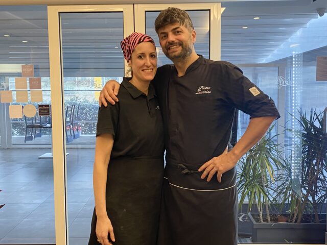 Pietro e Carolina hanno selezionato le materie prime che sono quasi prettamente laziali (90%), come la Fiaschetta di Sperlonga dell’Azienda Sanvida certificata senza nichel, la scarola provenienti da agricoltura biologica di Minturno, la mozzarella di bufala Casa Bianca di Fondi, il lardo di Scherzerino, giusto per citarne alcuni, mentre il 10% è campano, come il pomodoro San Marzano Dop di Sarno.