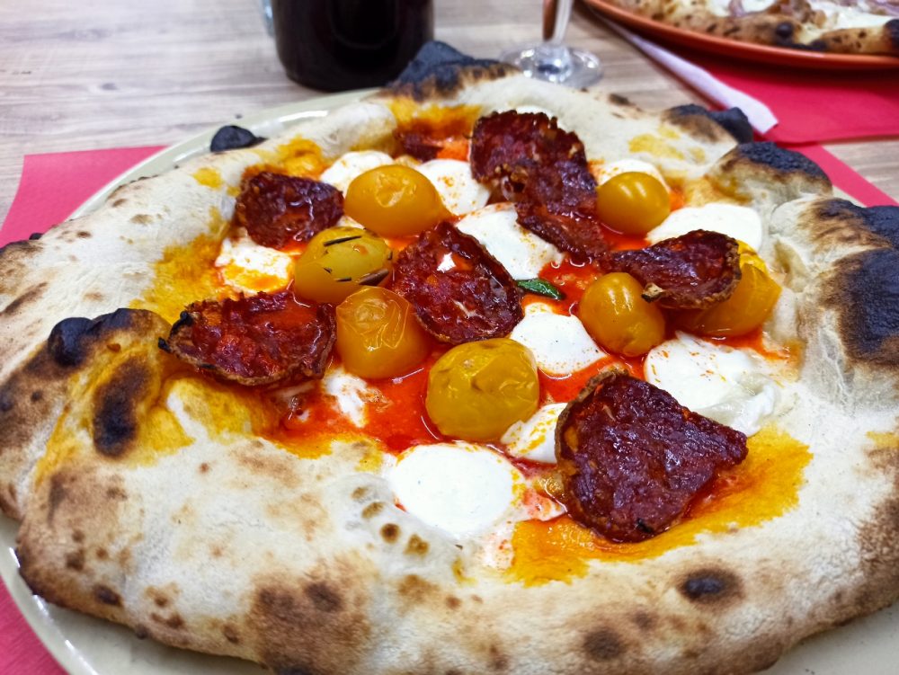 Assaggiamo dunque la gustosa Cacio & Pepe (7 euro) con Caciocavallo, Salsiccia, Pancetta e Pepe. E la nostra richiesta con Mozzarella di bufala, Pomodorini Gialli e Salame piccante (6 euro).