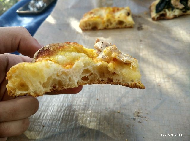 L’alveolatura è pronunciata, fitta, la pizza è leggera come una piuma e la lievitazione è con lievito madre.