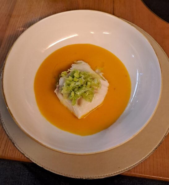Dalla bellissima cantina curata dal sommelier Giovanni Rispoli ci viene proposta prima Lyù, ovvero una simpatica bolla locale di fiano e falanghina, metodo classico, dosaggio zero, dell’azienda cilentana Polito e poi un notevole Franciacorta Riserva 2016 Barone Pizzini, sempre dosaggio zero ma di chardonnay e pinot noir.