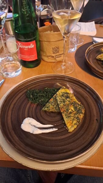Protagonisti indiscussi ai tavoli erano i calici, per i quali era prevista vicino una piccola cucina. L’idea di fondo, infatti, era ed è ancora quella di accompagnare i vini con i piatti e non viceversa. Piatti che nel corso degli anni, tuttavia, si sono fatti sempre più articolati e che oggi puntano a riproporre la tradizione culinaria cilentana. Una tradizione che è essenzialmente carne, soprattutto bianca e non mozzarella di bufala come comunemente si è portati a pensare, ma formaggi di capra. La nostra cena a cura dello chef Bruno Cirillo comincia con un tris di antipasti: frittata di barba di carote con barba di carote soffritta e panna acida, baccalà con crema di zucca e porro e, infine, polpetta di manzo con formaggio di capra.