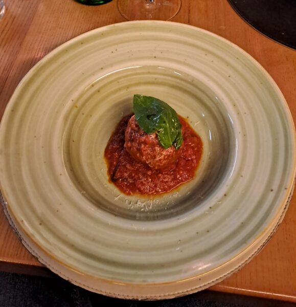 Dalla bellissima cantina curata dal sommelier Giovanni Rispoli ci viene proposta prima Lyù, ovvero una simpatica bolla locale di fiano e falanghina, metodo classico, dosaggio zero, dell’azienda cilentana Polito e poi un notevole Franciacorta Riserva 2016 Barone Pizzini, sempre dosaggio zero ma di chardonnay e pinot noir.