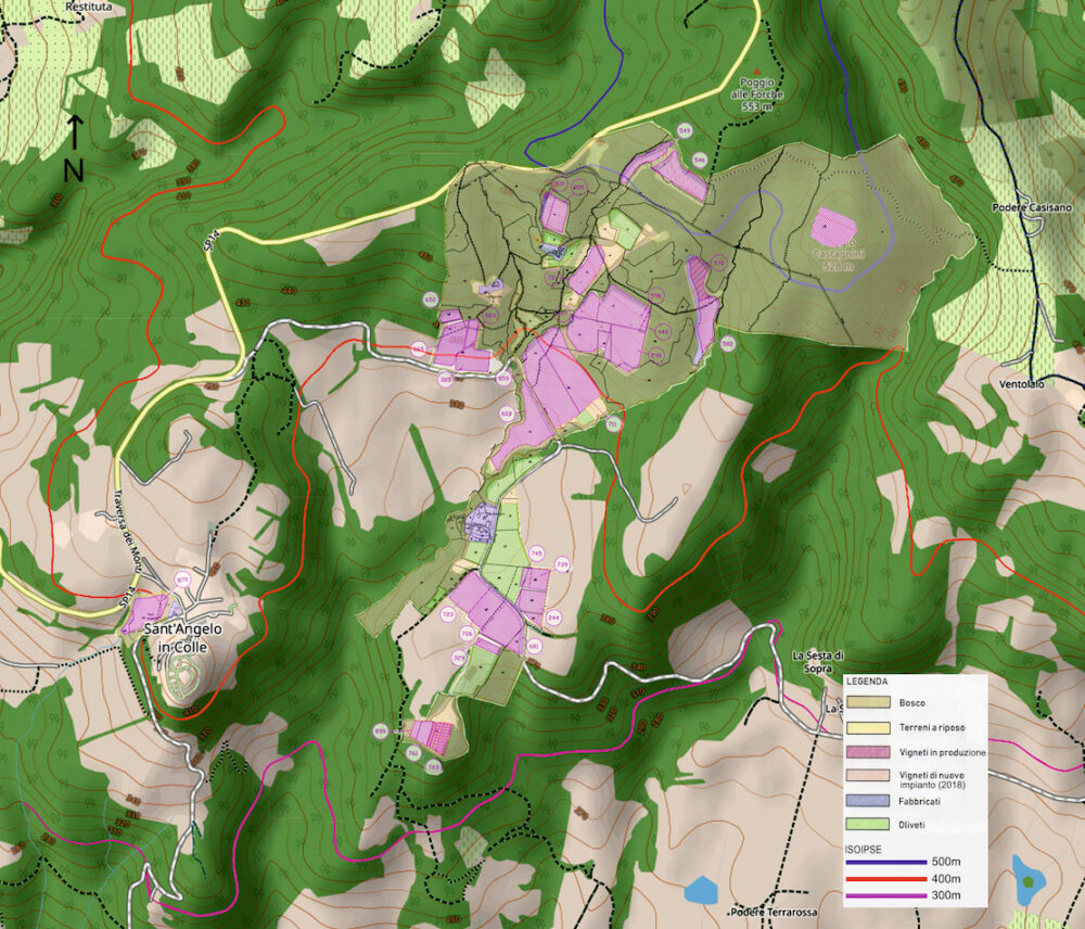La proprietà si estende per circa 160 ha nel quadrante sud-est di Montalcino; una parte situata ad un’altitudine media di circa 350 metri ed utilizzata perlopiù a vigneti, oliveti e seminativi. L’altra parte si trova a quote superiori ai 500 m.s.l.m. quasi interamente coperta da boschi, impervia,poco conosciuta agli stessi proprietari e rimasta tale fino al 2005. In questa parte di proprietà si trovavano dei seminativi, probabilmente furono anche vitati, ma abbandonati da lungo tempo perché poco raggiungibili per la coltivazione. Nel 2008 sono cominciati i lavori di recupero e scasso del terreno e di recinsione.