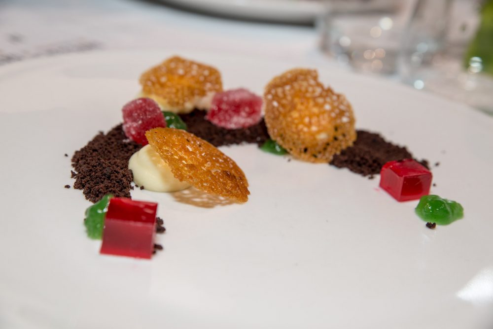 Il Croccante all’arancia del Gargano, spuma di cioccolato bianco e yogurt, gelè di melograno e terra di cioccolato è senza se e senza ma semplicemente impeccabile. Equilibrio, golosità, cromaticità.