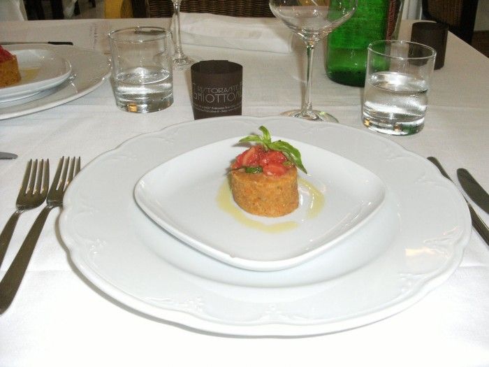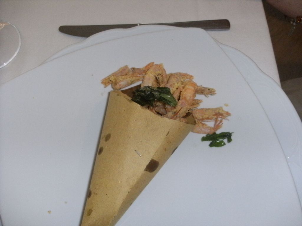 Mise en place e servizio perfetti e atmosfera rilassante. Come prima entrée Maria ha presentato la panzanella, una rivisitazione del povero e classico piatto contadino: un cilindro di pane raffermo rinvenuto nell’acqua, strizzato e condito con olio, spicchi di pomodorini freschi e basilico. Una vera bontà. Sempre per antipasto ecco il fritto di gamberi infarinati nel mais e presentati nel tipico cuoppo.