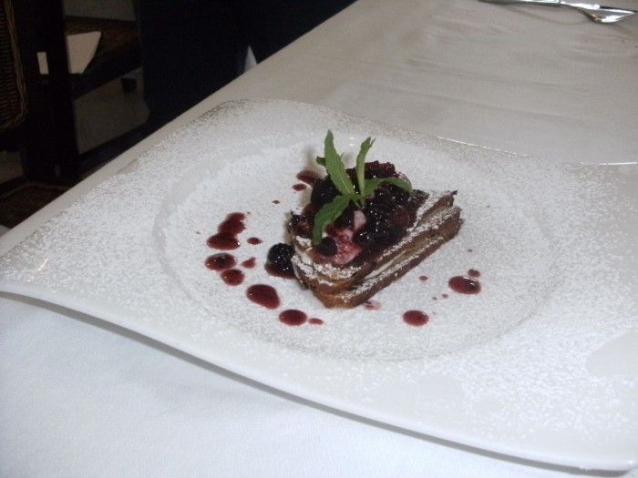 Un piatto molto leggero e che, seguendo il coerente filo conduttore di Maria, rimanda sempre all’abbinamento del pesce con i prodotti dell’orto. E qui è d’uopo anche apprezzare la linea decrescente di calorie e di grassi nelle preparazioni presentate. Questo significa che, oltre che brava cuoca, Maria è anche intelligente e perspicace. Capisce che la gente non può alzarsi da tavola “abbuffata” e poi mettersi in viaggio. Finiamo con i dolci. Sfogliatina calda alla crema, con frutta fresca; e pane di fichi con mousse di ricotta di capra e frutti di bosco. Deliziosi entrambi. Un percorso culinario edonisticamente perfetto!
