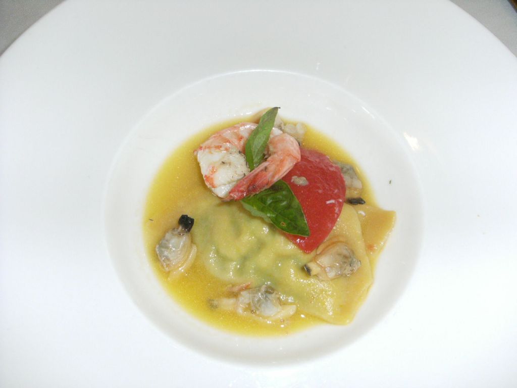 Ravioli, fusione di crostacei e verdure, con fumetto di vongole, gamberetti, pomodoro e basilico. Ecco qui una pietanza che ci ricorda che siamo proprio di fronte al mare più pulito della Campania e che anche la terra dà i suoi buoni frutti. Segue poi un semplice e gustoso piatto di spaghetti, vongole, peperoni verdi e mollica di pane fritto.