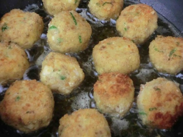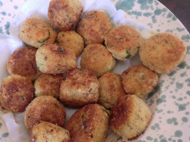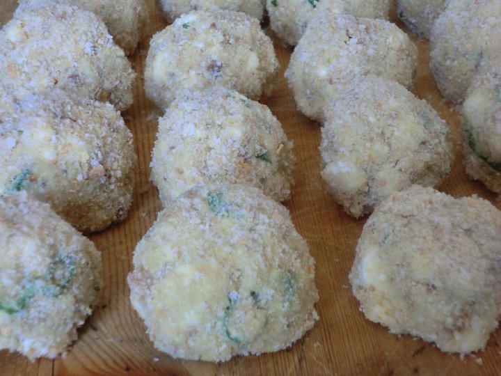 Ho messo a bagno in acqua una decina di grosse fette di pane raffermo semi-integrale. L'ho poi strizzato perbenino e messo in una ciotola capiente con due uova intere sbattute, 70 gr circa di parmigiano grattugiato, 50 gr di primo sale di pecora tagliato a dadini piccolissimi, 70 gr di fiordilatte in pezzi, 50 gr circa di caciocavallo a cubetti, 100 gr circa di ricotta di bufala prima avevo schiacciato con la forchetta (insomma: ho svuotato in frigo il piatto dei formaggi). Ho aggiunto una manciata di prezzemolo sminuzzato, un po' di sale e pepe, un'idea di noce moscata e delle striscioline di peperoncino verde per regalare al tutto un profumo estivo. Ho impastato il pane con tutti gli ingredienti e ne ho ricavato delle polpette. Le ho impanate nel pangrattato e poi fritte per pochi minuti, fino a dorarle, nell'olio extravergine di oliva.