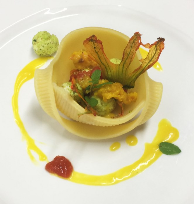 Polpettine di padduni con pane alle erbe peperoni e fiori di zucca con gocce di pomodoro