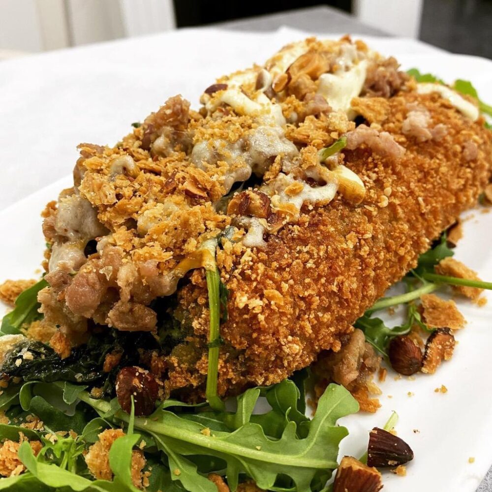 Pomodo’ Crocche’ Pomodo’ – Maxi crocche’ di patate farcito con ricotta, mortadella Bologna IGP e granella di pistacchi
