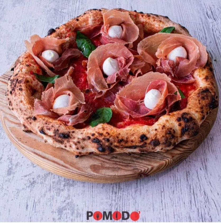 Pomodo’ Pizza Anto DOC, Pomodoro campano bio, all’uscita prosciutto crudo di Parma , bocconcini di bufala , basilico e olio evo