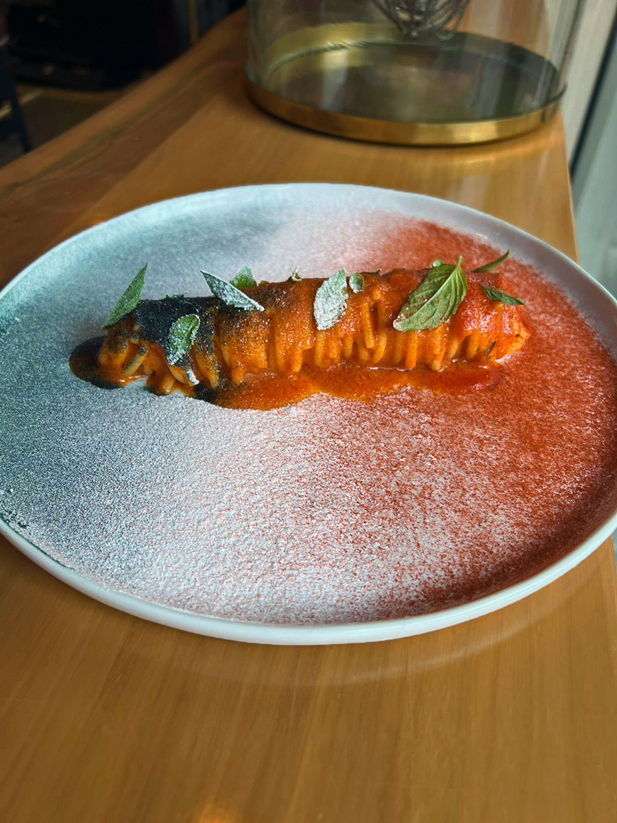 L’idea del piatto nasce dalla nostalgia culinaria del Belpaese. La ricetta, dunque, unisce quei sapori legati proprio all’immagine ideale di italianità che, per Alessandro, rappresentano e ricordano “casa”; un connubio di tre tipi di pomodori, su un piatto decorato con i 3 ingredienti principali della salsa stessa: Basilico, Olio e Pomodoro.