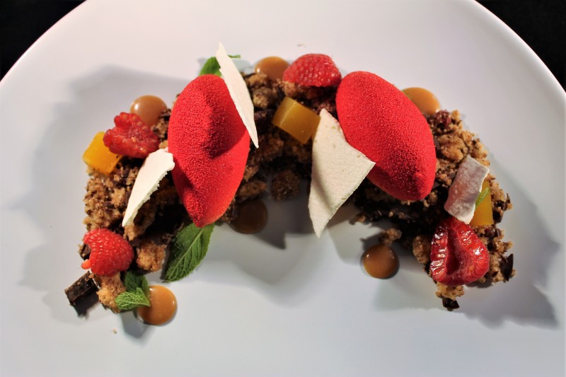 Posizionare a forma di luna il crumble di lamponi e cioccolato , posizionare 2 quenelle all’acqua di pomodoro e posizonare un po di menta fresca. aggiungere 3 cubetti di pomodoro giallo , un pò di spuntoni di caramello all’acqua di pomodoro, e intervallare il tutto con le lastre di meringa italiana , aggiungere dei lamponi freschi per completare .