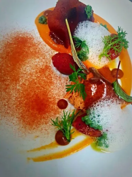 Adagiare la spuma di pomodoro sul fondo, formando una goccia con il cucchiaio; aggiungere due spugne di pomodoro, qualche punta di gel di pomodoro arrosto, pomodorini confit e le sfoglie di pomodoro con le quali si andranno a coprire le spugne. Ai lati porre l’aria di acqua di pomodoro; infine cospargere il piatto di polvere di pomodoro, caviale di basilico e erbe aromatiche.