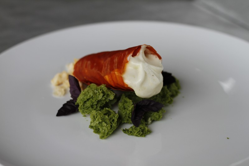 Sbollentare e poi freddare con acqua e ghiaccio il basilico e il prezzemolo e poi centrifugare il tutto. In una “bastardella” unire gradualmente tutti gli ingredienti, versare nel sifone il composto e farlo riposare per 3 ore in frigo. Riempire con il composto gli stampi da muffin per 3/4 , cuocerli al microonde per 30 secondi a 800 watt, poi metterli in abbattitore capovolgendo i bicchierini e una volta freddati far asciugare le spugne verdi per 3 ore a 65° C.