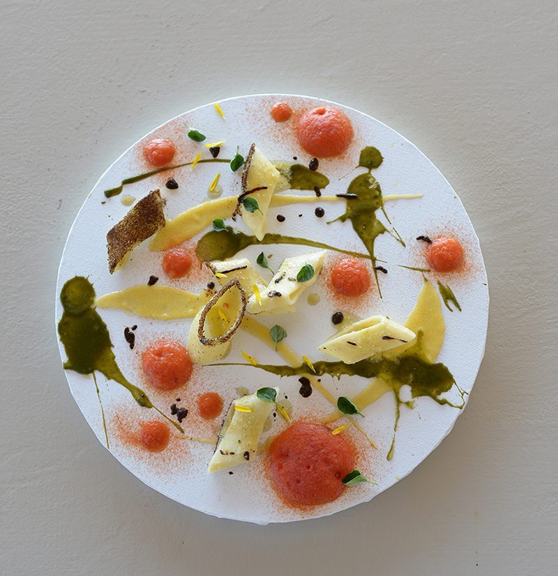 Nel frattempo, cospargere sulla tela, con l’aiuto di un cucchiaio, la composta di pomodoro giallo, l’estratto di alloro verde e la salsa di noci. Successivamente, spolverare leggermente la pasta con la polvere di porro, che ricorderà il sapore del grano tostato, e disporla sulla tela. Sifonare la spuma di pomodoro rosso, spolverare con la polvere di pomodoro e ultimare con puntini di aglio nero.