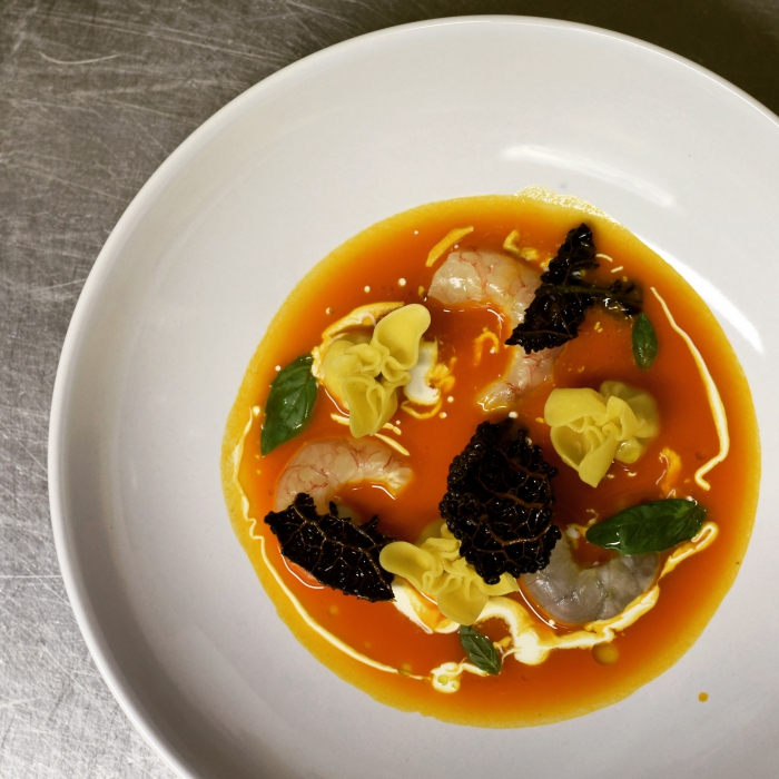 Preparare prima la vellutata di pomodoro soffriggendo la salsa con l'olio verace e il basilico ed aggiungere poi il brodo. Preparare la pasta all'uovo con tuorli e farina, preparare il ripieno con ricotta e tartufo e pepe. Marinare le mazzancolle coi semi del pomodoro e l'olio e il basilico. Friggere le foglie di cavolo cappuccio. Riempire la pasta e creare dei sacchettini. Ovviamente lessare la pasta e poi comporre il piatto. La salsa "bianca" è solo olio montato con la successiva marinatura.